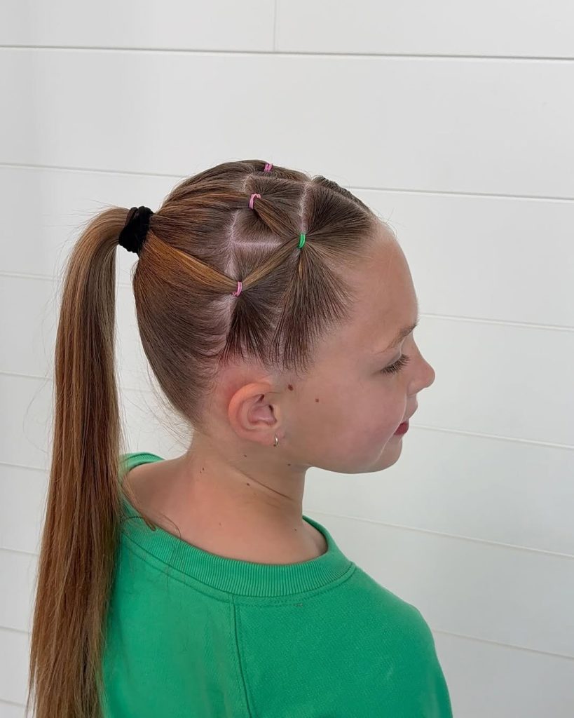 This structured ponytail proves that adorable, easy, long-hair styling doesn’t need heat or heavy products. Clean sections across the crown are secured with small elastics, leading into a smooth, low ponytail that feels youthful yet polished.