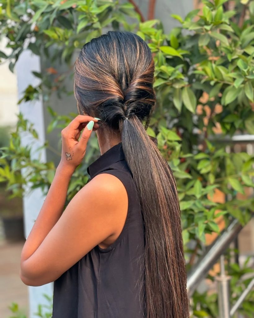 Here, minimalism meets intention. A low ponytail wrapped at the base creates a refined silhouette that feels elevated without effort. This style is perfect for professional settings and transitional seasons when hair needs to stay controlled.