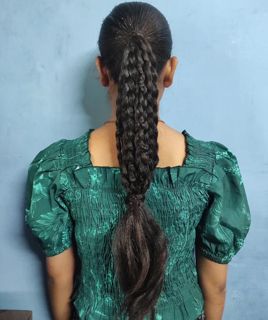 This braided ponytail is all about practicality and protection. Clean braids flow into a single length, keeping hair secure while highlighting natural density and shine.