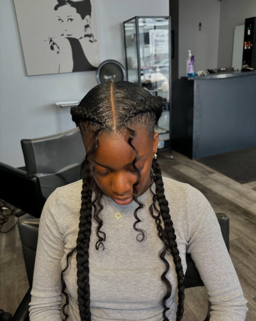 This hairstyle blends precision with softness, making it one of the most wearable protective looks moving into 2026. A clean center parting anchors two long braids, while delicately styled baby hairs frame the face and add dimension. The balance between structure and flow makes this ideal for women who want something practical without feeling overly styled.