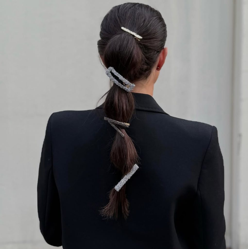 Hair accessories take center stage here. A smooth, low ponytail is elevated with strategically placed embellished clips, turning a basic style into something editorial.