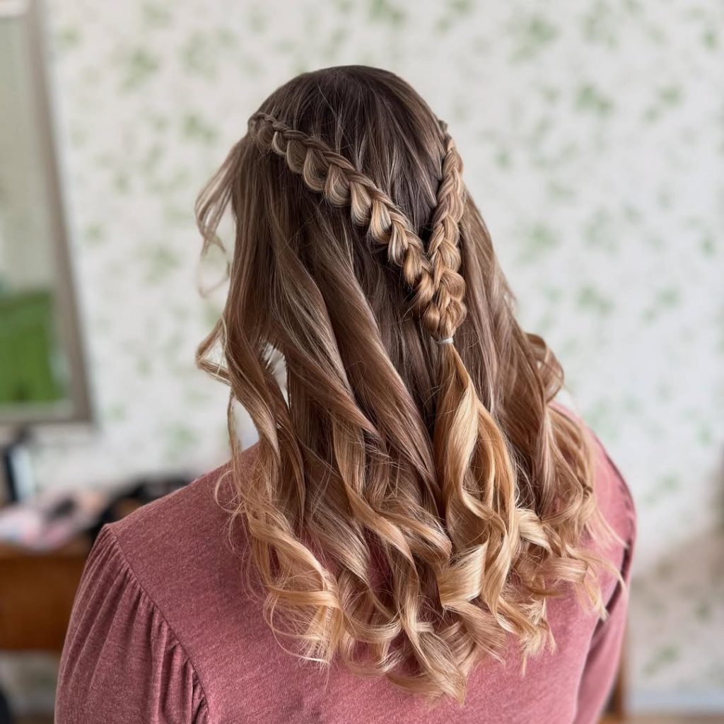 A softly braided crown paired with loose curls delivers a feminine, romantic silhouette. The braid adds structure at the top, while the flowing curls keep the style approachable and wearable.