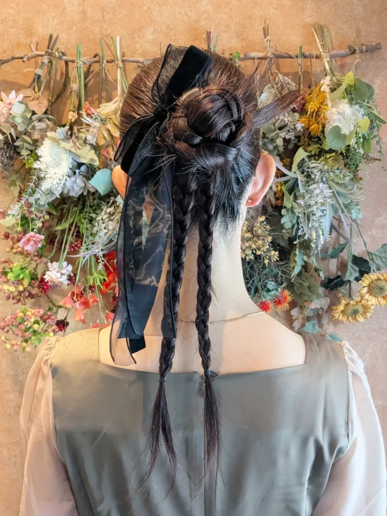 This hairstyle blends classic elegance with a modern edge. A smooth braided base leads into a compact bun, finished with a sheer black ribbon that adds drama without overpowering the look. The exposed braids trailing beneath the bun create visual interest and elongate the neckline.