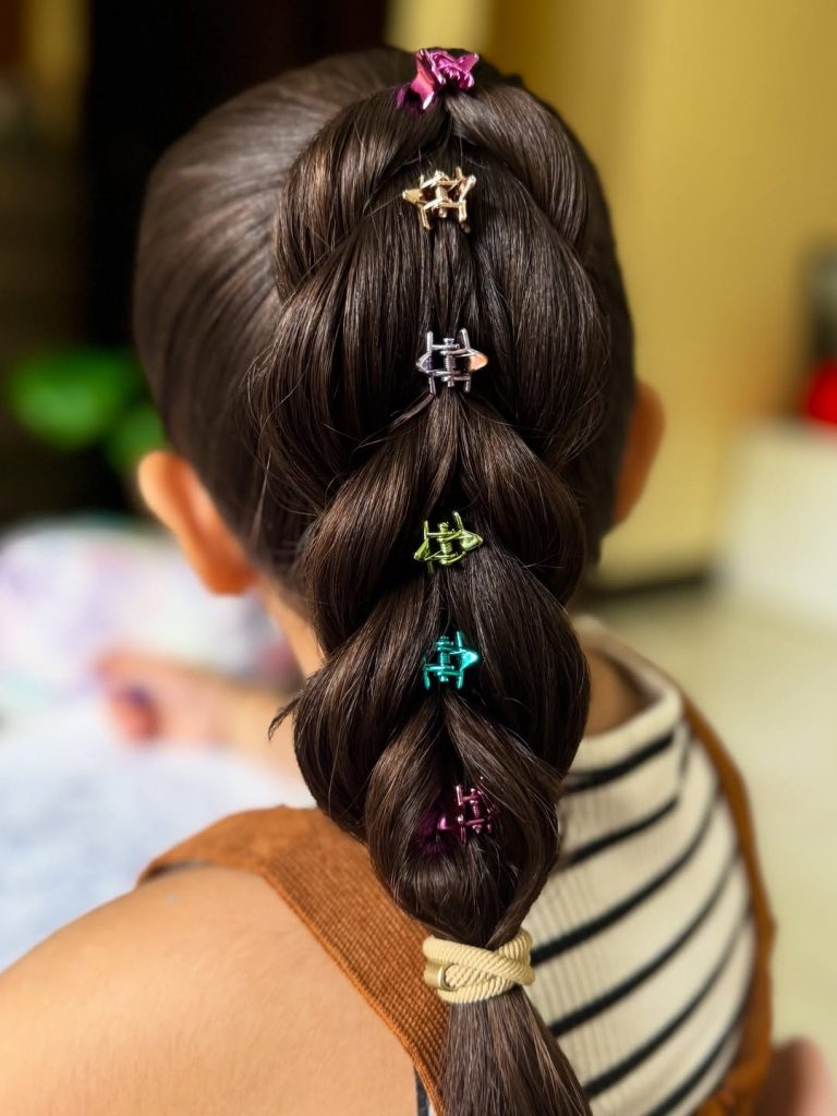 The bubble ponytail continues to evolve, and in 2026 it’s all about personalization. Small decorative clips placed along each section turn a basic ponytail into something playful and expressive.