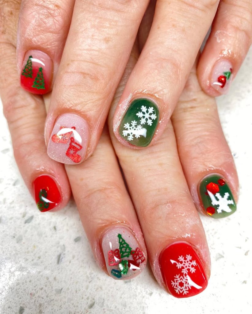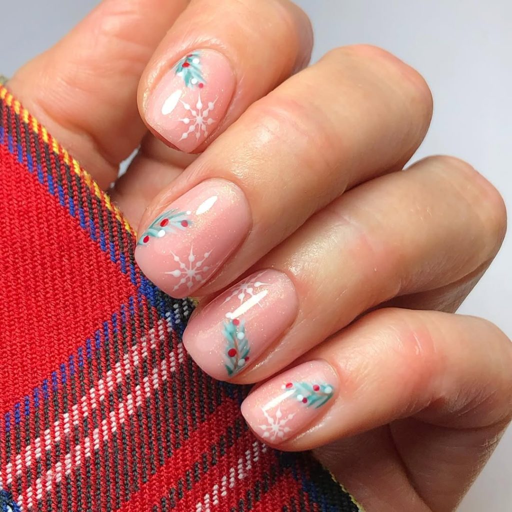 A whisper- pink nude shot with micro shimmer, dotted white snowflakes, and tiny teal holly leaves with berry accents. It’s the low-maintenance option that still reads festive in every lighting situation—from office LEDs to candlelit dinners.