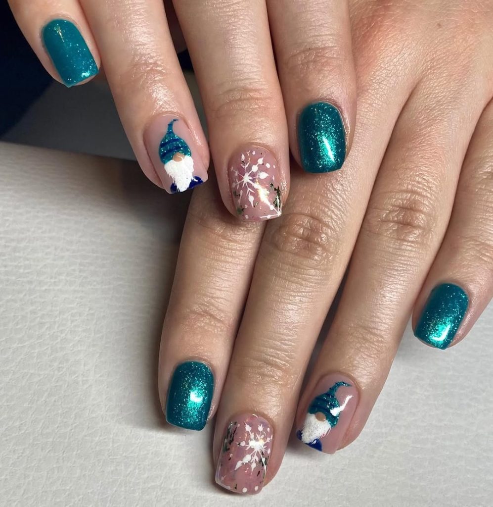A charming twist on the classic red: mulled teal with micro-sparkle on a blush-nude canvas scattered with white snowflakes and the cutest little winter gnomes. Short square tips ensure that these characters remain mundane for day-to-day wear. white snowflakes and the most adorable winter gnomes. Short square tips keep the characters wearable for everyday.