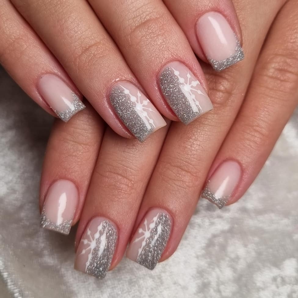A holiday French to save for minimalists: sheer pink base, micro-glitter silver tips with a single vertical snowflake, and a softly shimmering panel. It’s elegant enough for a December wedding guest look and understated enough for weekday meetings. glitter silver tips, plus a single vertical snowflake and a soft shimmering panel. It’s elegant enough for a December wedding guest look and understated for weekday meetings.