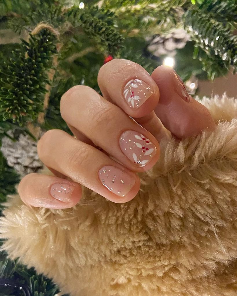 Barely there nude with twinkle dust and a single sprig of holly—white leaves, tiny red berries—fresh rather than fussy. It’s like the manicure equivalent of a cashmere sweater: soft, cozy, quietly polished.