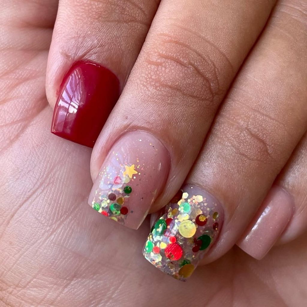 This set plays with texture: a rich red accent nail anchors champagne-nude bases that fade into holographic confetti—think star sequins, round paillettes, and green-gold glints arranged like a tiny tree.