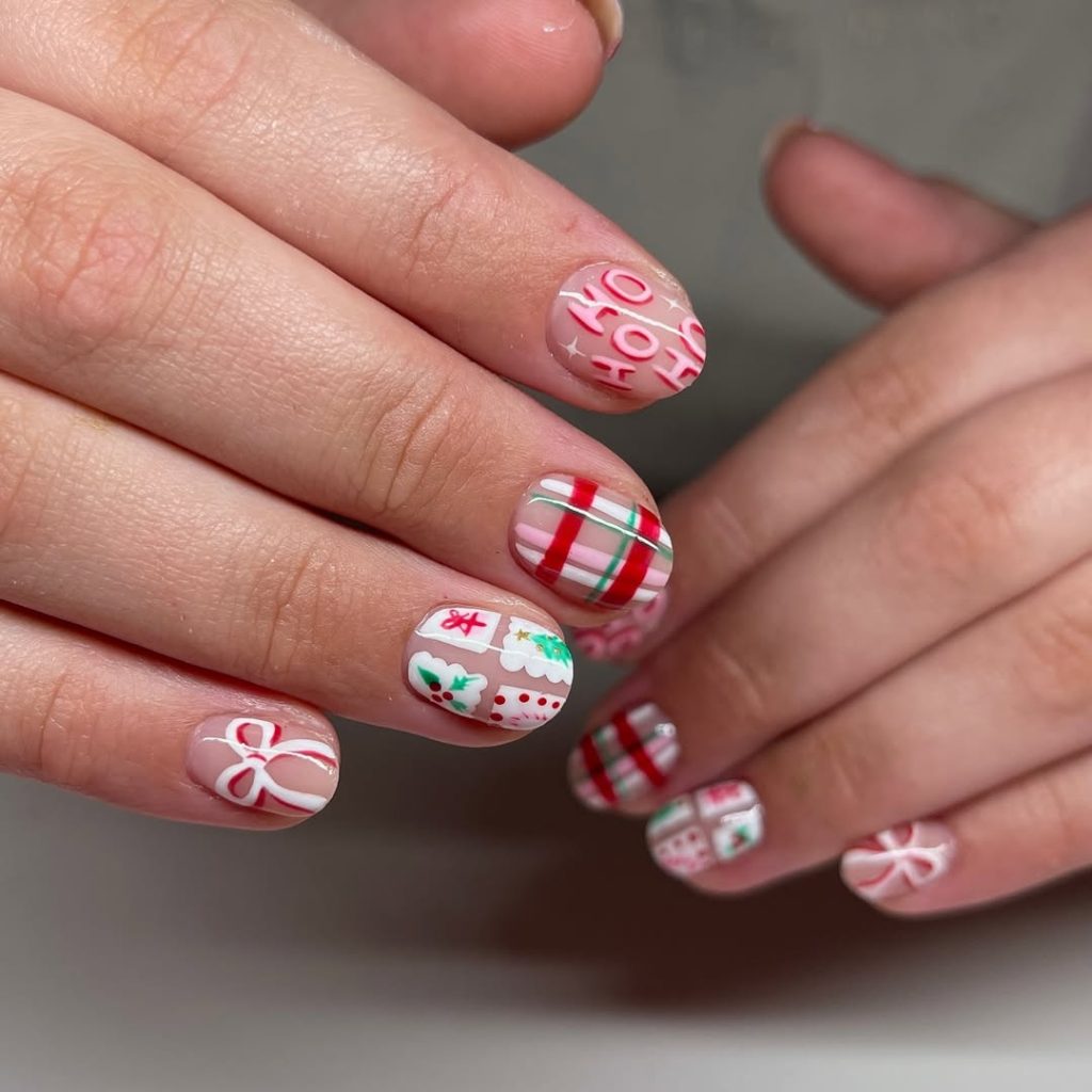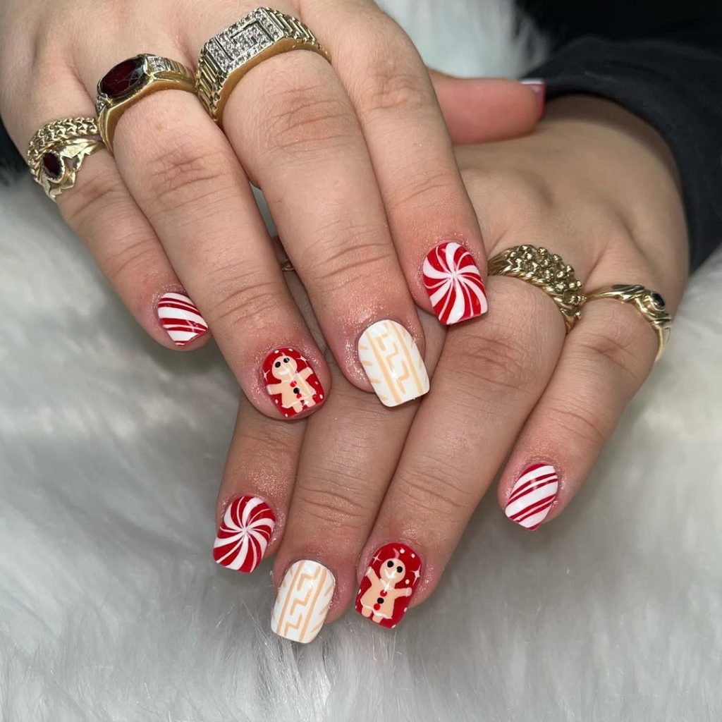 Why it works: Repeating two motifs ( candy cane and gingerbread) across hands creates cohesion; negative space and one neutral nail prevent overload.