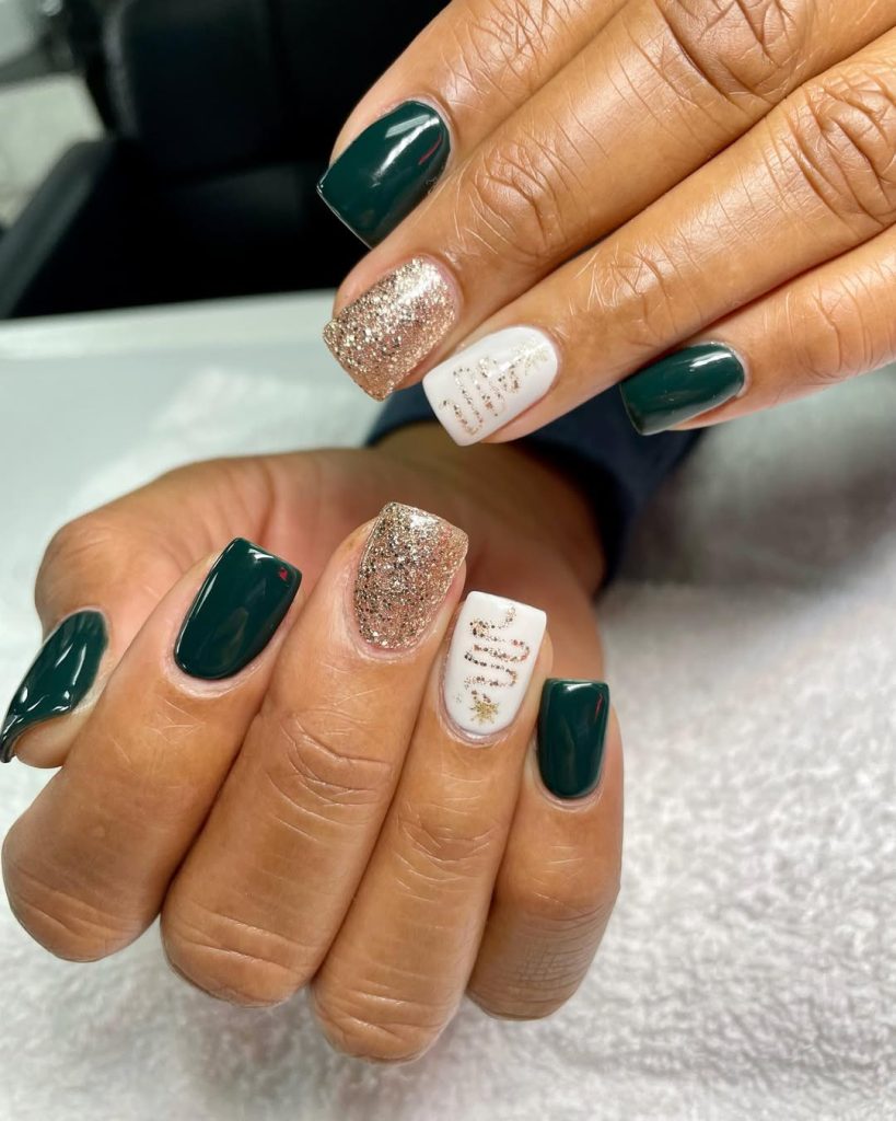 Deep green squares paired with two champagne glitter accents and a white negative-space tree on crisp porcelain create a luxe, adult-holiday vibe. The contrast makes short nails look polished and intentional—like a velvet blazer with a sequin cami.