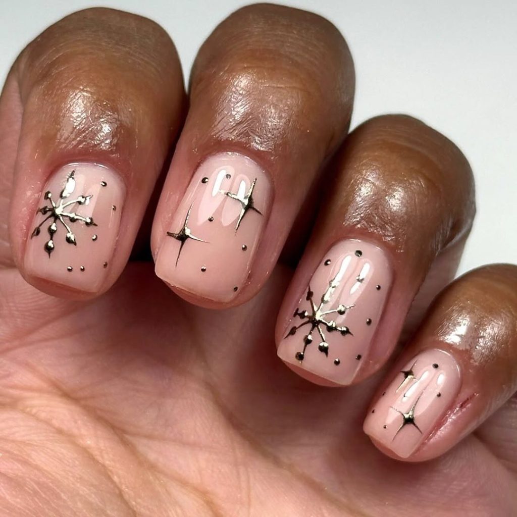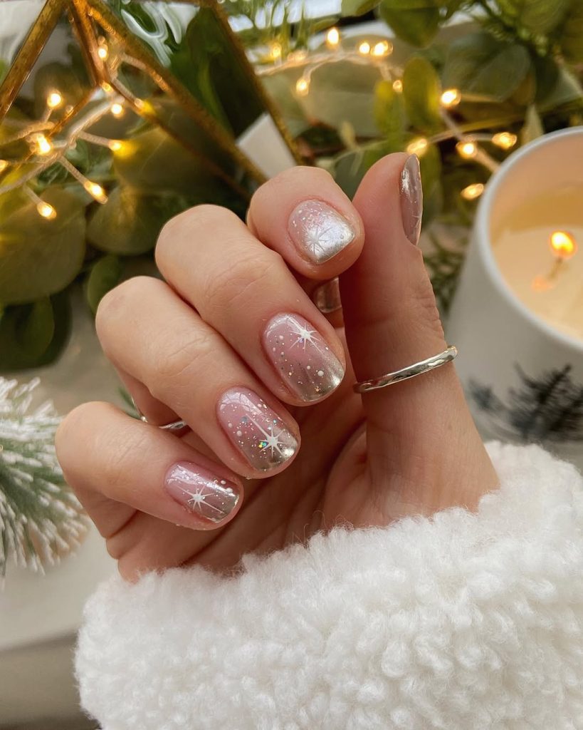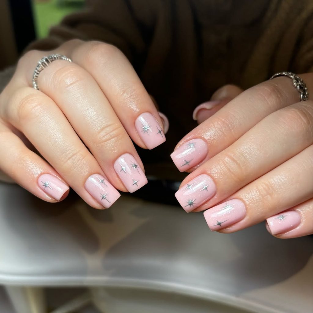 Sheer pink nails dotted with fine, chrome-silver starbursts—minimal but sparkling, like holiday lights through frost. This set is a December all-rounder: school concerts, office mixers, weekend errands.