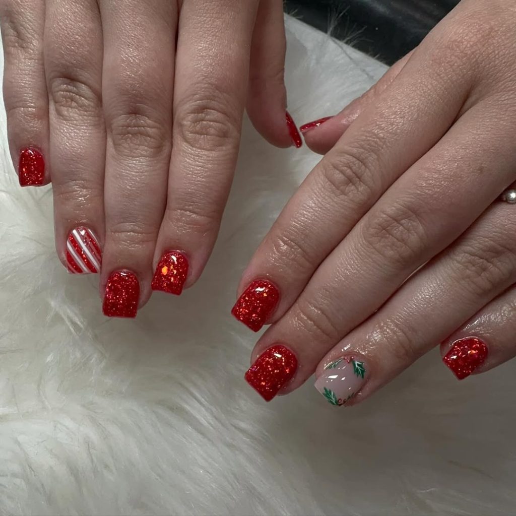 Five-point ruby red micro-glitter nails set the stage for two story-telling accents: a peppermint candy cane stripe and a nude nail dotted with evergreen sprigs. The uniform short length makes the sparkle feel polished, not loud.