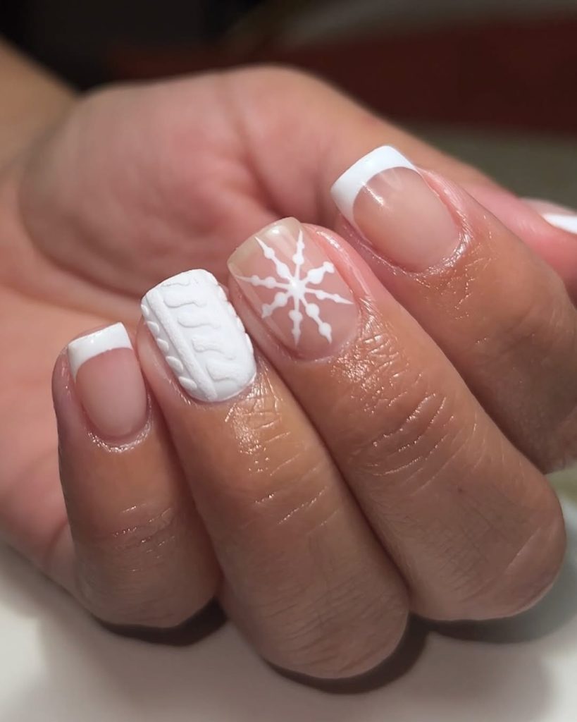 Modern French tips meet cable-knit texture on two accent nails and delicate white snowflakes. The sweater-stitch relief brings dimension that looks incredible on short squares—snug, soft, winter-ready.
