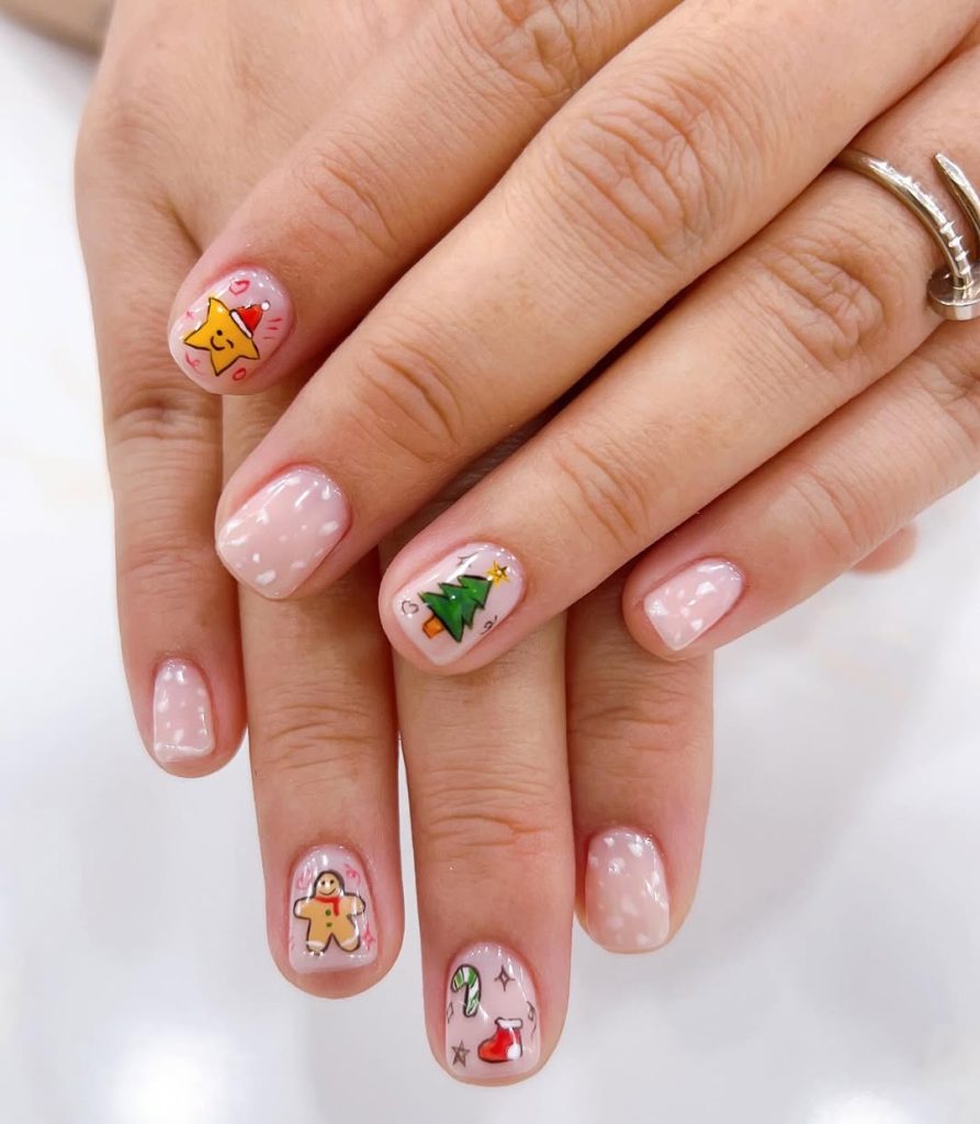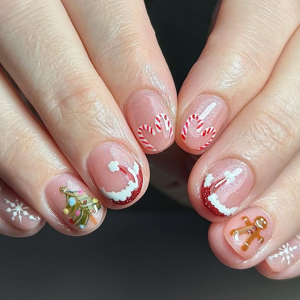 Sheer twinkle pink with hand-drawn classics—curved Santa-hat trims, two candy cane hearts, a tiny tree, and a glossy gingerbread—delivers maximum nostalgia on minimum length. The micro glitter base feels like fresh snow.