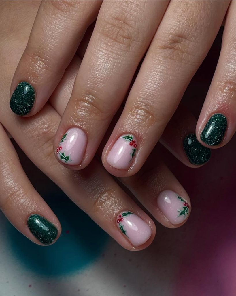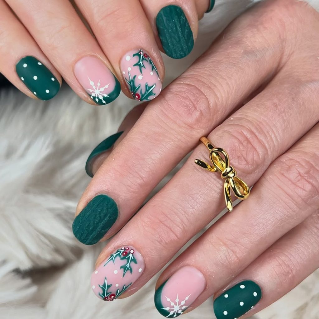 Matte forest green wraps most nails like a velvet ribbon, while rosy-nude accents carry raised holly leaves, berry dots, and crisp white snowbursts. On short ovals, the mix of textures—matte, glossy, and a hint of 3D—reads elevated rather than busy.