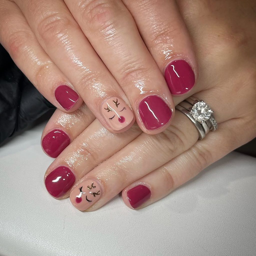 Five nails in glossy mulled-wine red frame a single nude accent with a minimalist reindeer face: sleepy lashes, gold antlers, and a berry nose. It’s playful yet polished—think novelty sweater, but make it chic.