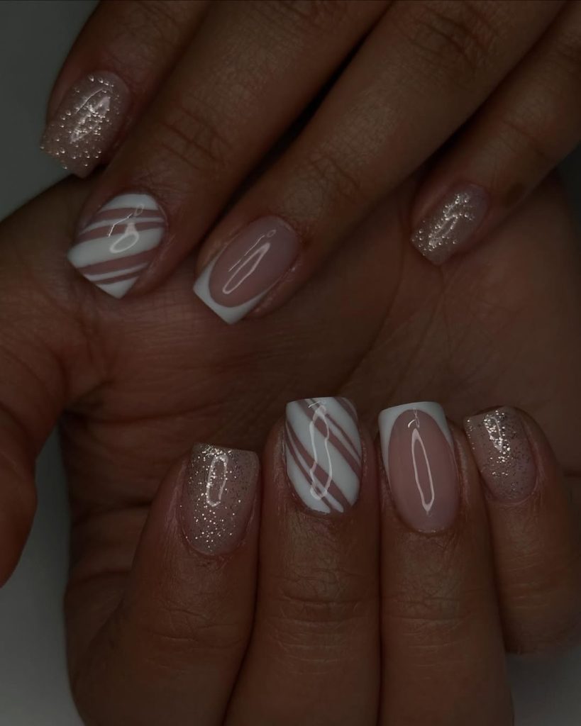 A milky neutral base meets two accents: whisper-thin white French tips and diagonal peppermint stripes in latte-and-cream. Champagne glitter on select nails adds party light without stealing focus.