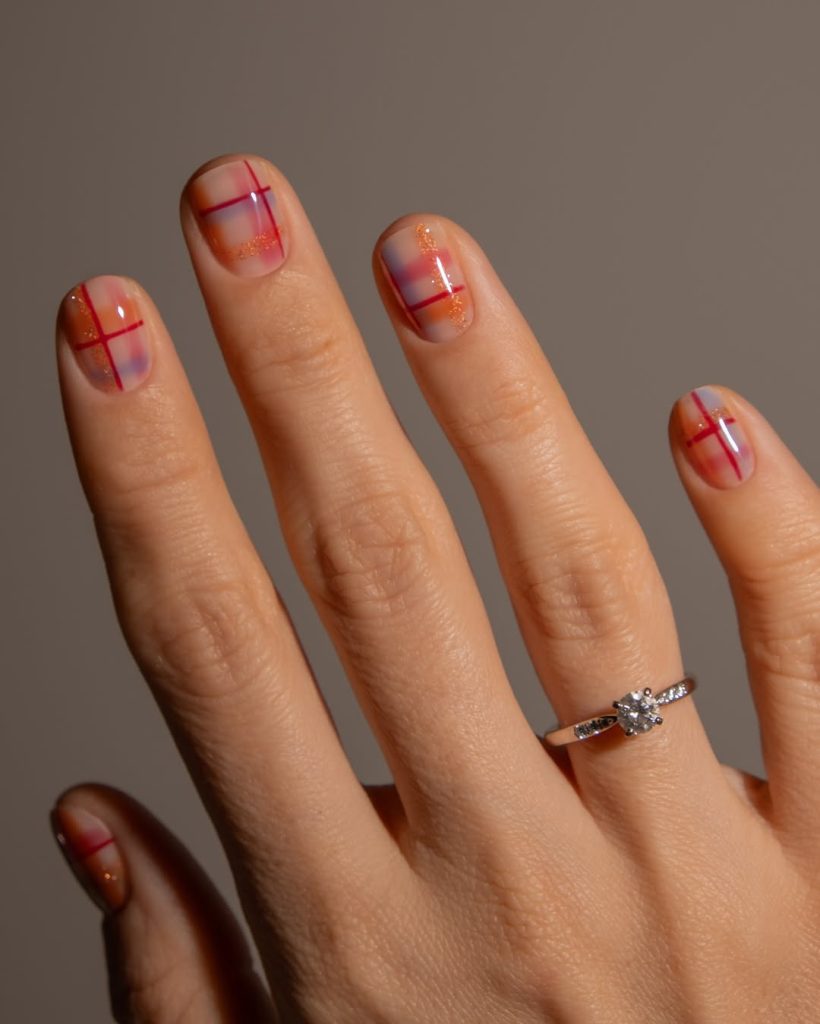 Translucent nude nails carry sheer washes of rose and lilac, crossed with fine red lines and a whisper of golden shimmer—like delicate gift wrap under warm lights.