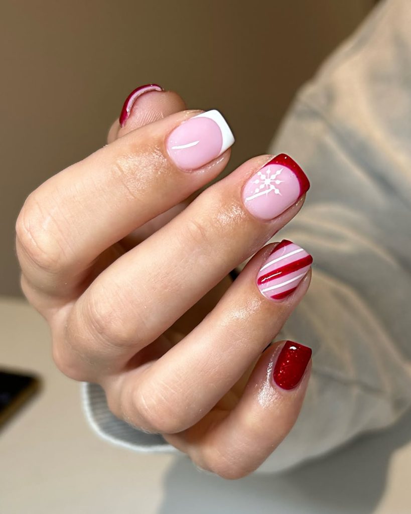 A clever mash-up of micro French in crisp white , glossy red French, a single snowburst on milky pink , and diagonal candy cane stripes. The short square shape keeps the palette punchy but wearable—like a satin headband with a cashmere sweater.