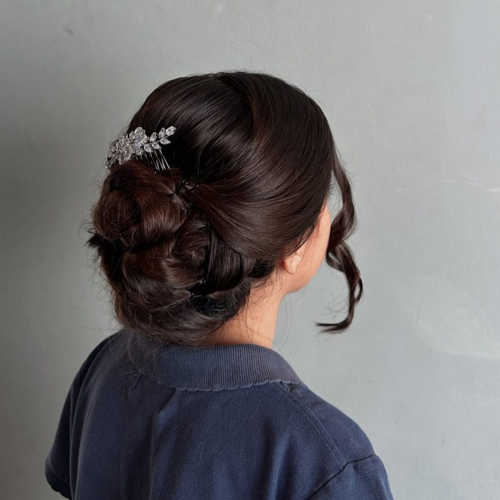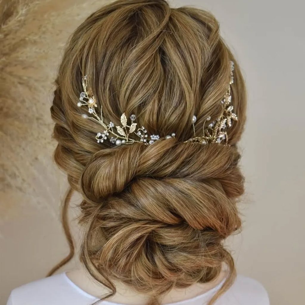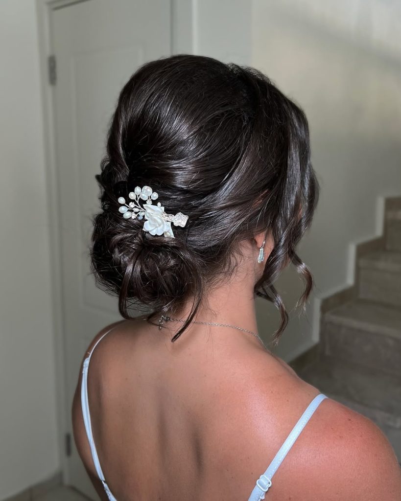 Delicate twists and micro tendrils gather into a softly textured knot accented by a floral comb. The result is relaxed but ceremonial—think garden venues and candlelit receptions. It’s elegantly low, gently textured rather than messy, and wonderfully simple to maintain through a long night for wedding looks.