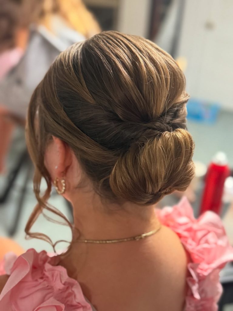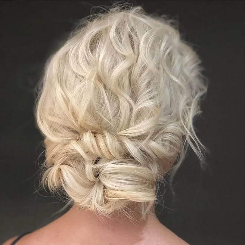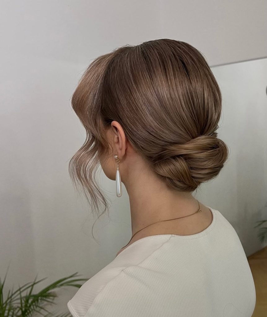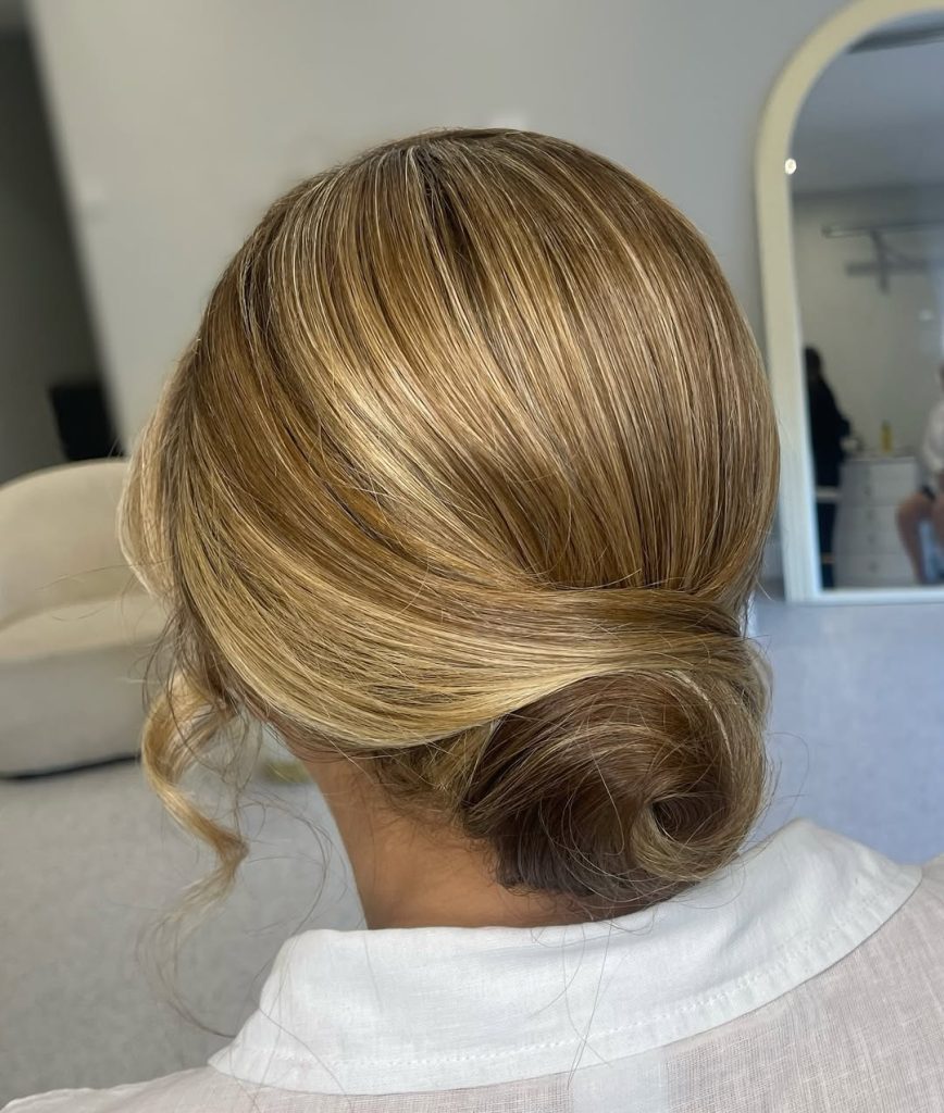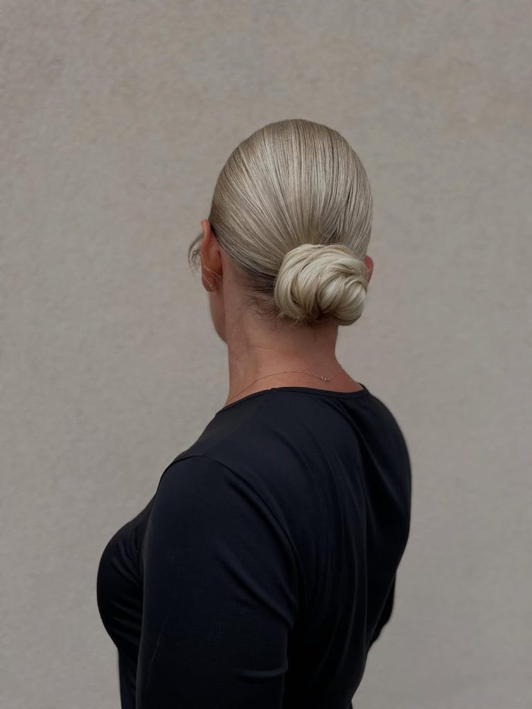 Feathery waves gather into a relaxed knot with just enough flyaway texture to feel alive. This is the bun I recommend when time is tight but you still want intention. It flatters layered bobs and lobs and keeps movement around the crown.