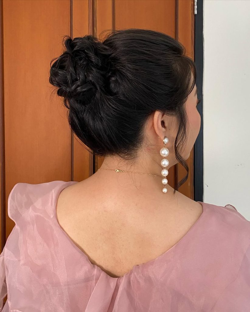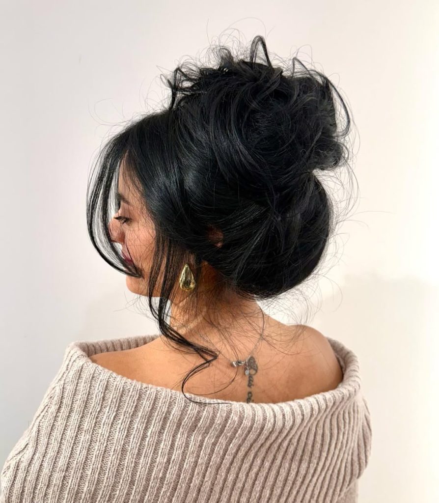 Lifted curls and wispy tendrils create a weightless, cloud-like knot that moves with you. It’s flirty, face-lifting, and perfect for brunch, concerts, or summer weddings as a guest.