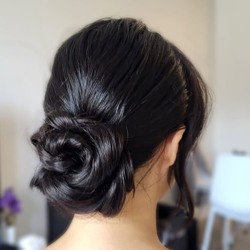 A gentle wave sweeps from a side part into a rolled chignon at the nape, with a soft tendril along the neckline. It channels Old Hollywood restraint—clean, feminine, and endlessly wearable from office to evening.