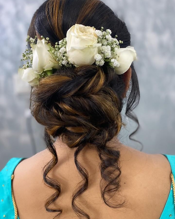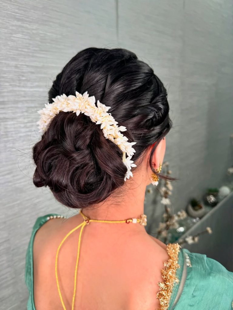 Styling notes: Work a shine cream through mids-to-ends, create soft rope twists, and coil into a compact knot. The floral arc should sit slightly above the bun so it’s visible from every angle. Pair with gold jhumkas and a sari or embellished gown; a neutral lip lets the flowers sing.