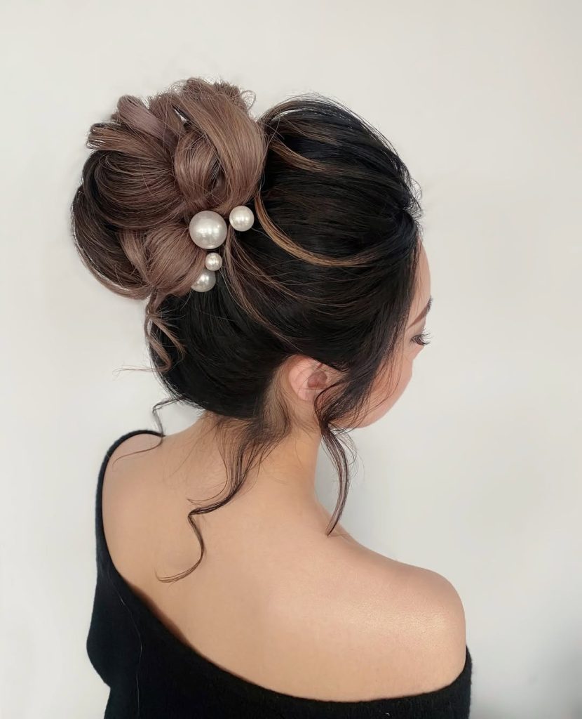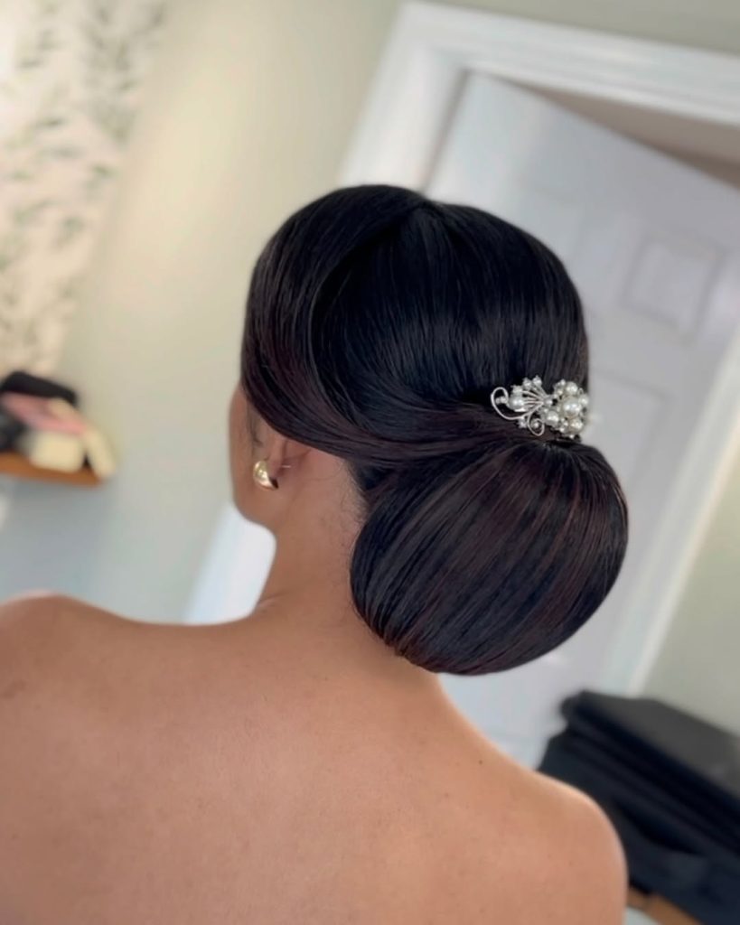 A glossy, sculpted side sweep feeds into a perfectly contained chignon at the nape. The smooth surface reads couture, while a pearl-and-crystal brooch adds just enough sparkle to catch evening light. It’s the definition of low, slick, and classic and a go-to for wedding season or any formal event where polish matters for long hair.