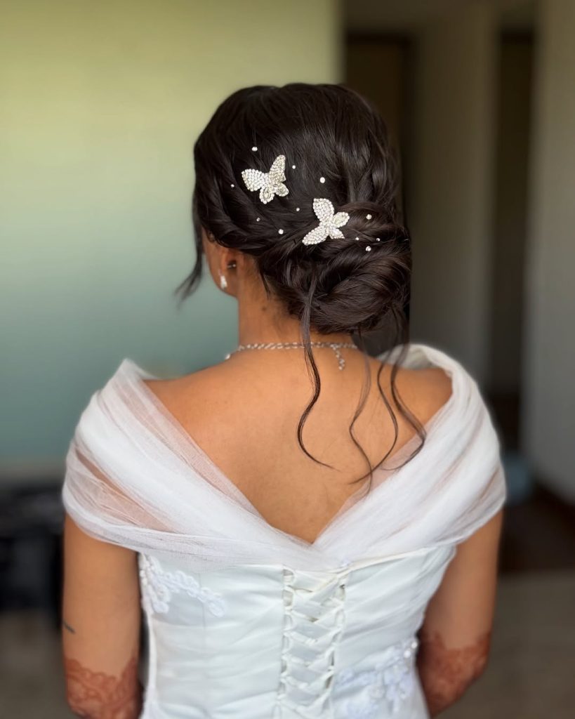 A softly twisted bun dotted with crystal butterflies and micro pearls—storybook romantic without veering saccharine. The airy pieces along the neck ensure movement during first dances and candid hugs.