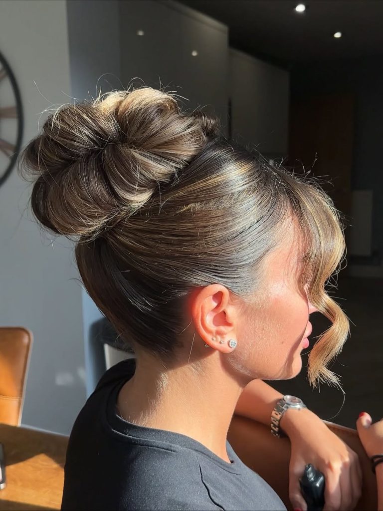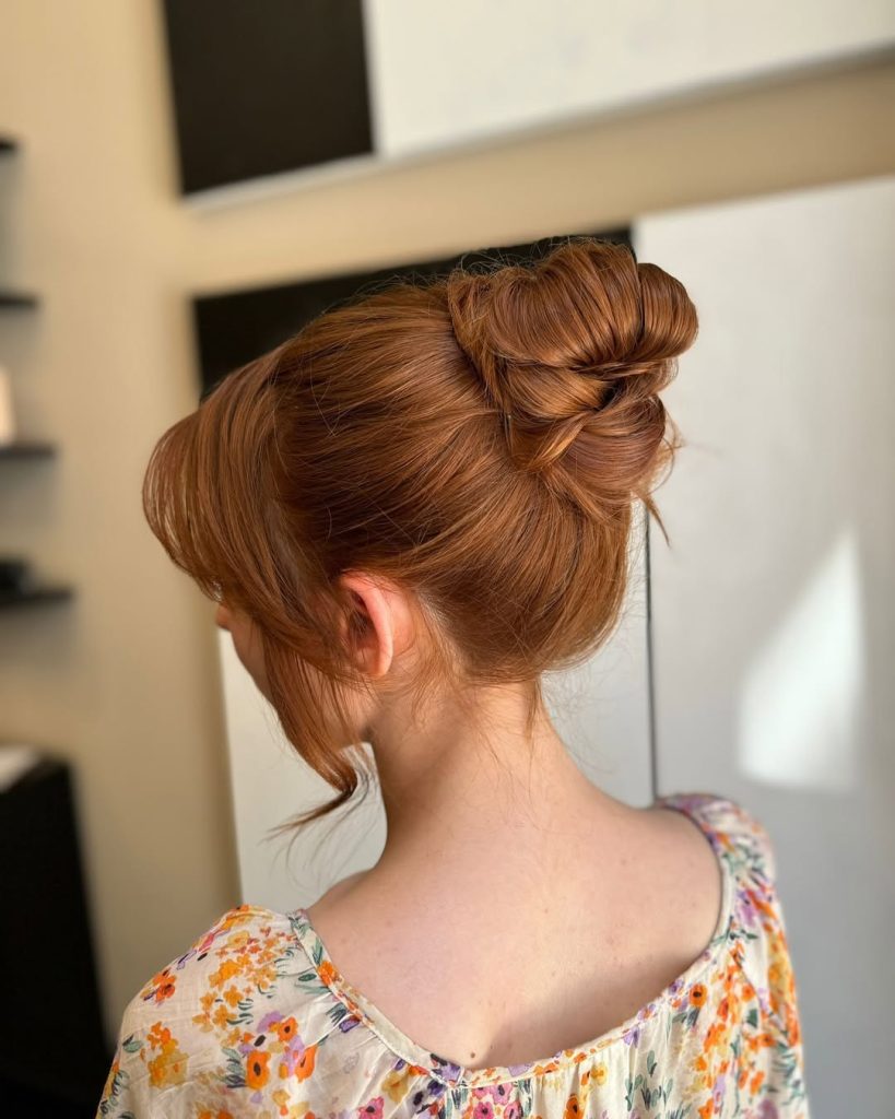 A gently teased crown and loose, face-framing layers make this the most wearable bun of the group. It’s the hair equivalent of a perfectly broken-in blazer—effortless yet intentional.