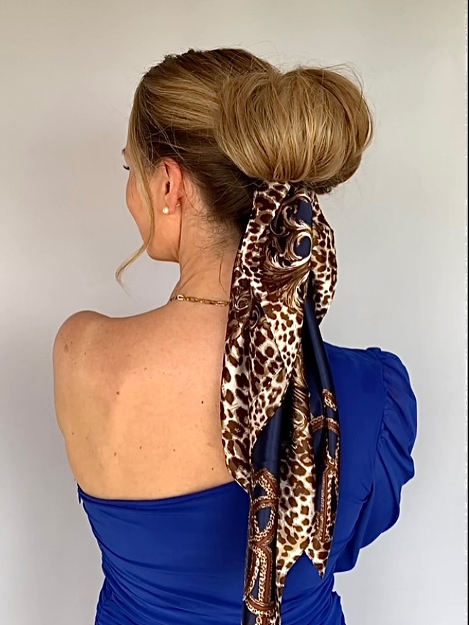 Style notes: Build the volume with dry shampoo and light teasing, then secure a loose bun and thread the scarf through the base like a ribbon. Match the scarf tones to your dress or clutch for a pulled-together look.