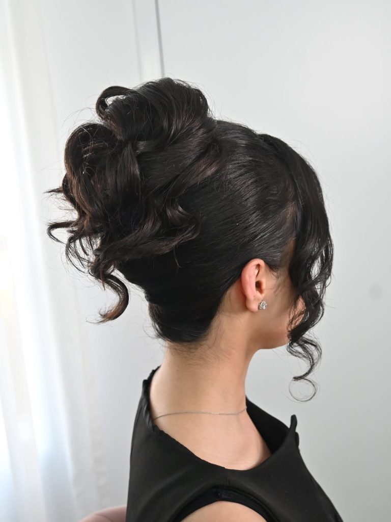 Defined curls are lifted into a high, cloud-like bun while tendrils sculpt the cheekbones and nape. The silhouette is festive and face-lifting—perfect for gala nights, holiday parties, or a summer wedding guest look.