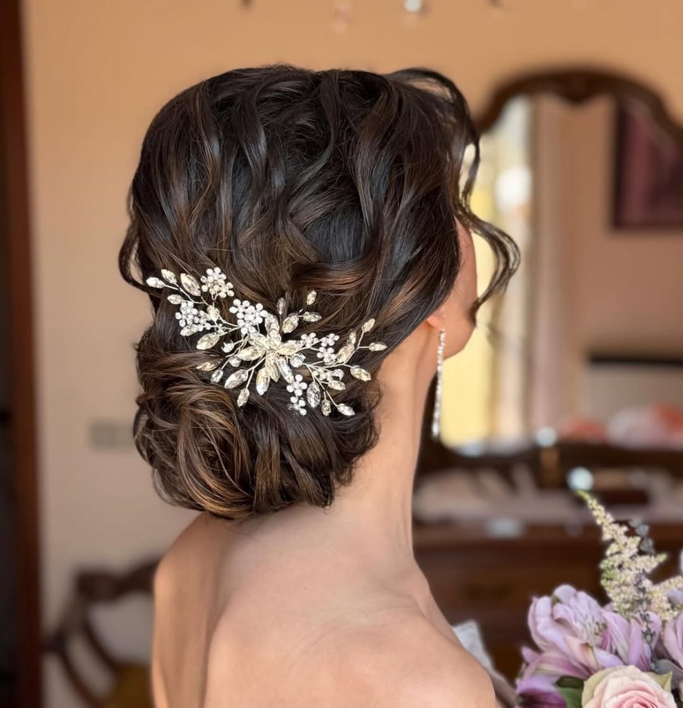 Undone waves tuck into a low, sculpted bun set off by a starburst crystal clip. The combination of texture and sparkle fulfills the modern-romantic aesthetic that many brides request.