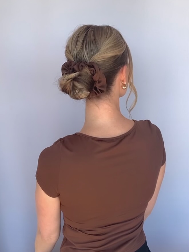 Two coffee-brown scrunchies cradle a loose, casual knot at the nape. It’s weekend hair done right—intentional, quick, and gentle on the strands.