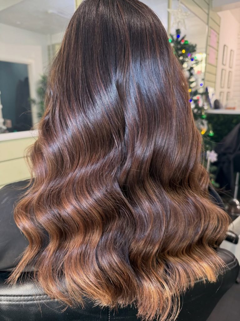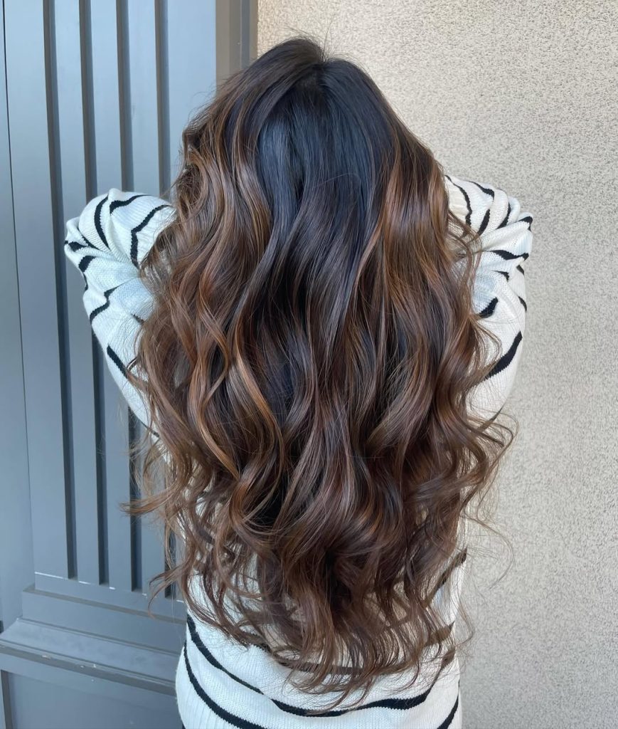Mocha-chestnut waves with Balayage softness and Honey warmth