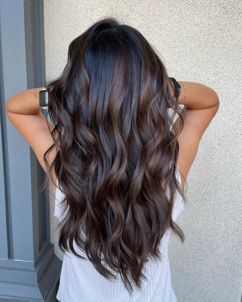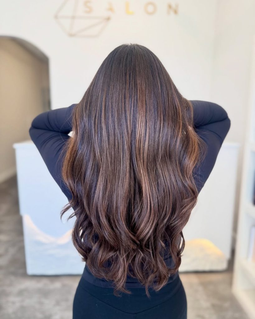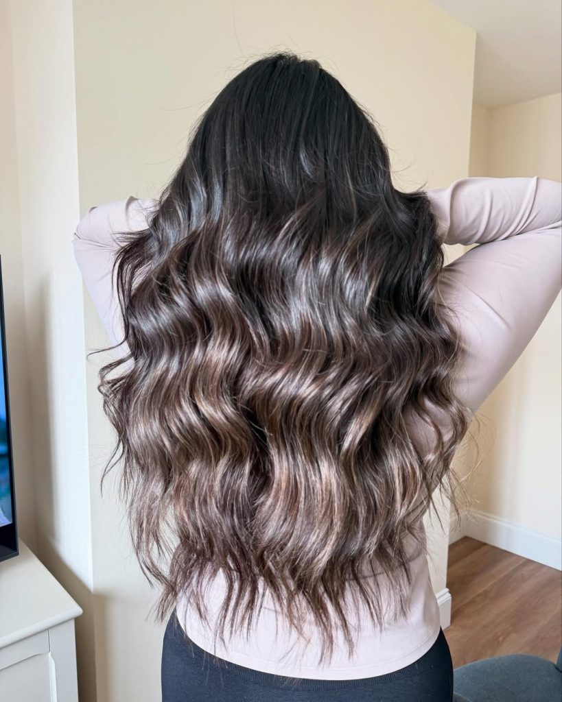 This one lives in the espresso end of chestnut—nearly black at the root, then shifting into smoky brunette tones through the waves. The dimension is low-contrast and tonal, the kind with highlights and a dark effect that looks natural but elevated. Instead of bright pieces, the movement comes from shadow and shine.