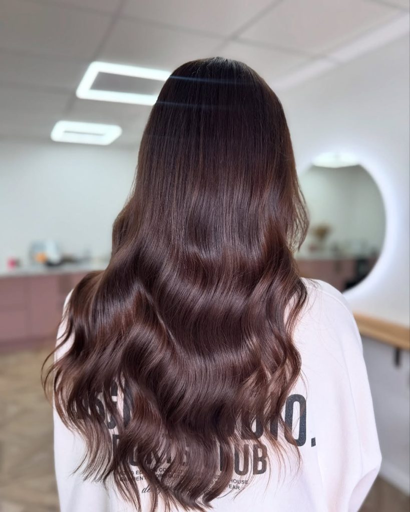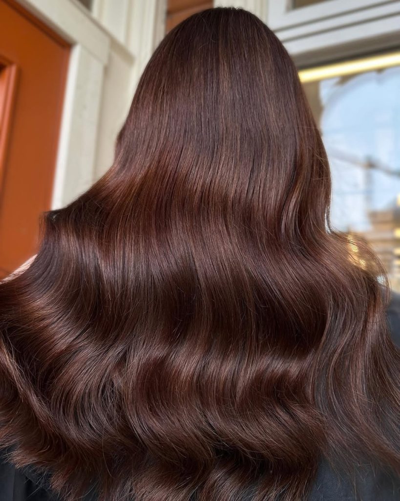 Deep Dark chestnut waves: glossy, sleek, and quietly dramatic