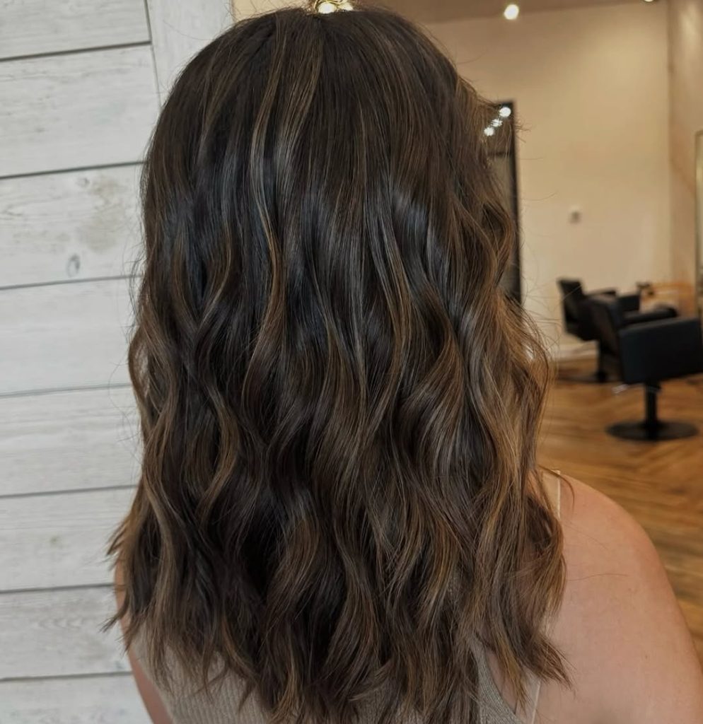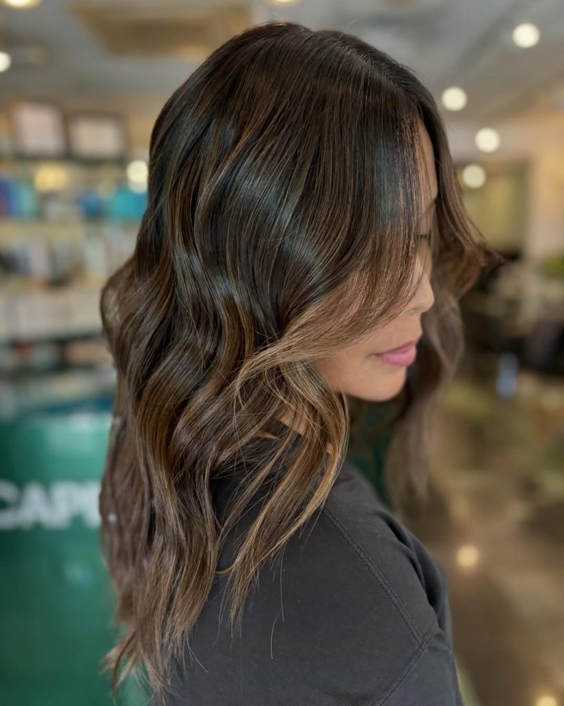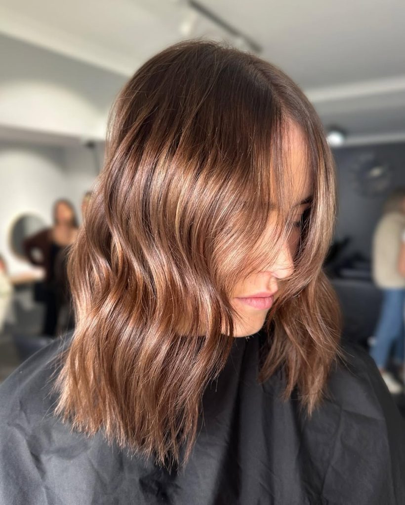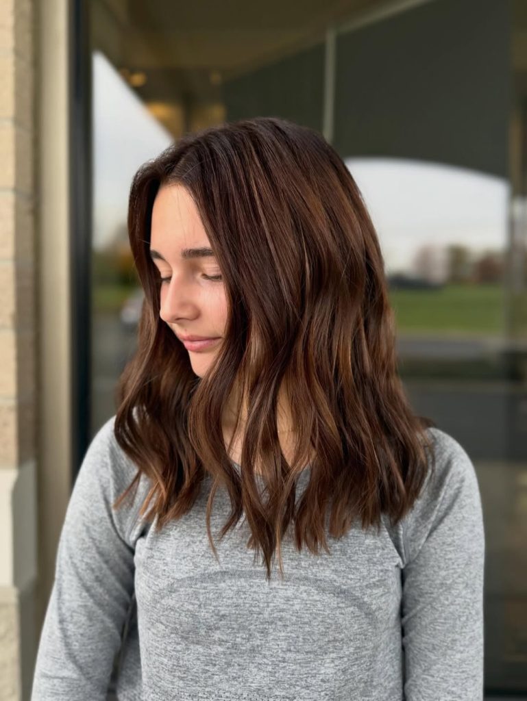 This shoulder-length cut is the grown-up answer to “I want highlights, but I don’t want upkeep.” The base is darker chestnut, then balayage softly lifts the mid-lengths with warm ribbons that read sun-kissed, not blonde. The wave pattern is loose and natural—exactly what makes this feel lived-in and modern.