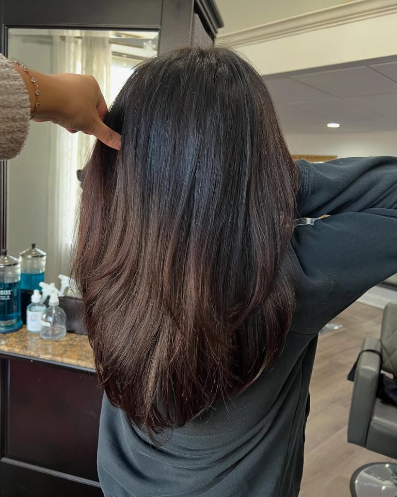 This is a great option if you want dark hair that still looks dimensional in photos (hello, holiday parties and event season). It also works beautifully for women who wear a lot of black—because the hair doesn’t disappear into the outfit. The black top shown here is a perfect backdrop for the shine and shape.