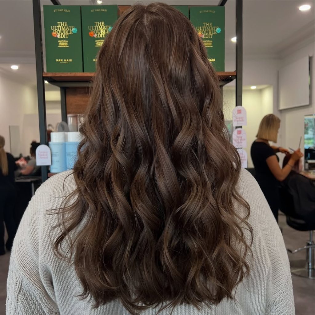 Long, uniform S-waves make this chestnut look extra dimensional. The base stays deep, while warm ribbons through the lengths create that “lit from within” effect—exactly the kind of highlights color that photographs beautifully but still reads professional in real life. The warmth leans caramel, but it’s blended so smoothly it never turns stripey.