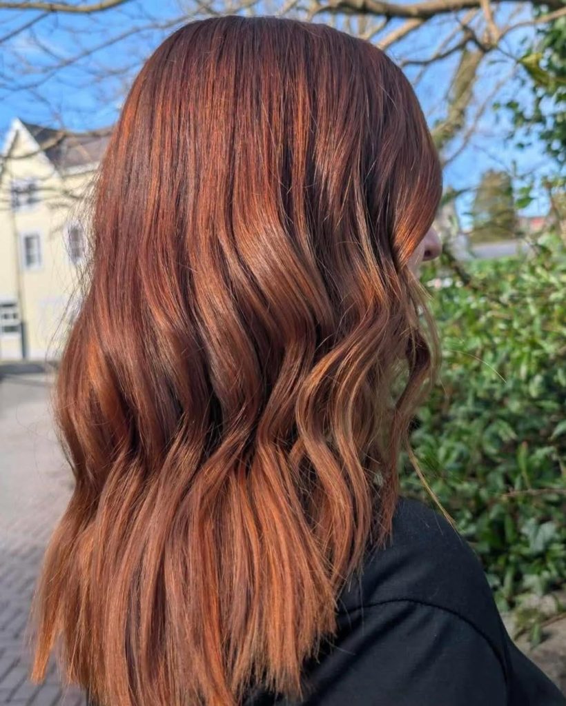 This take leans more coppery—still chestnut, but turned up with a warm, fiery sheen that looks incredible outdoors. The tone has a golden-copper reflection and brighter ribbons that catch daylight like satin. It’s the kind of brunette that doesn’t need a bold lipstick to feel “done,” because the hair already carries the statement.