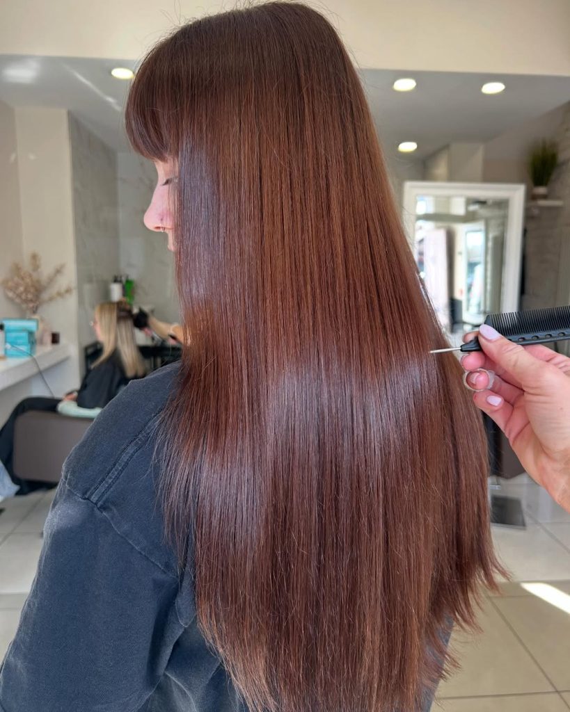 Fringe changes everything—and with chestnut, it can feel like a full rebrand without touching your wardrobe. This look is sleek and straight with a blunt bang, and the tone leans warm auburn while staying grounded in chestnut. The shine is so intense it reads almost like “glass hair,” which is exactly why warm brunette shades are trending again: they look luxurious when they’re healthy.
