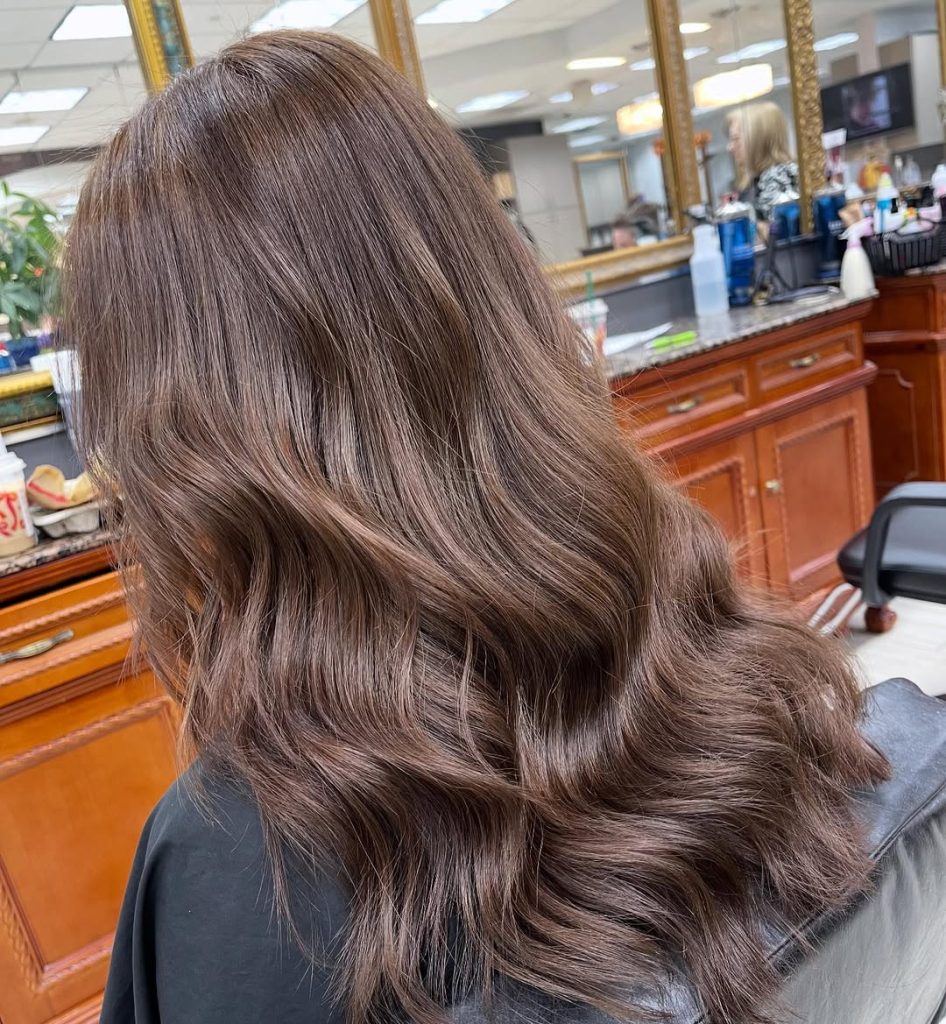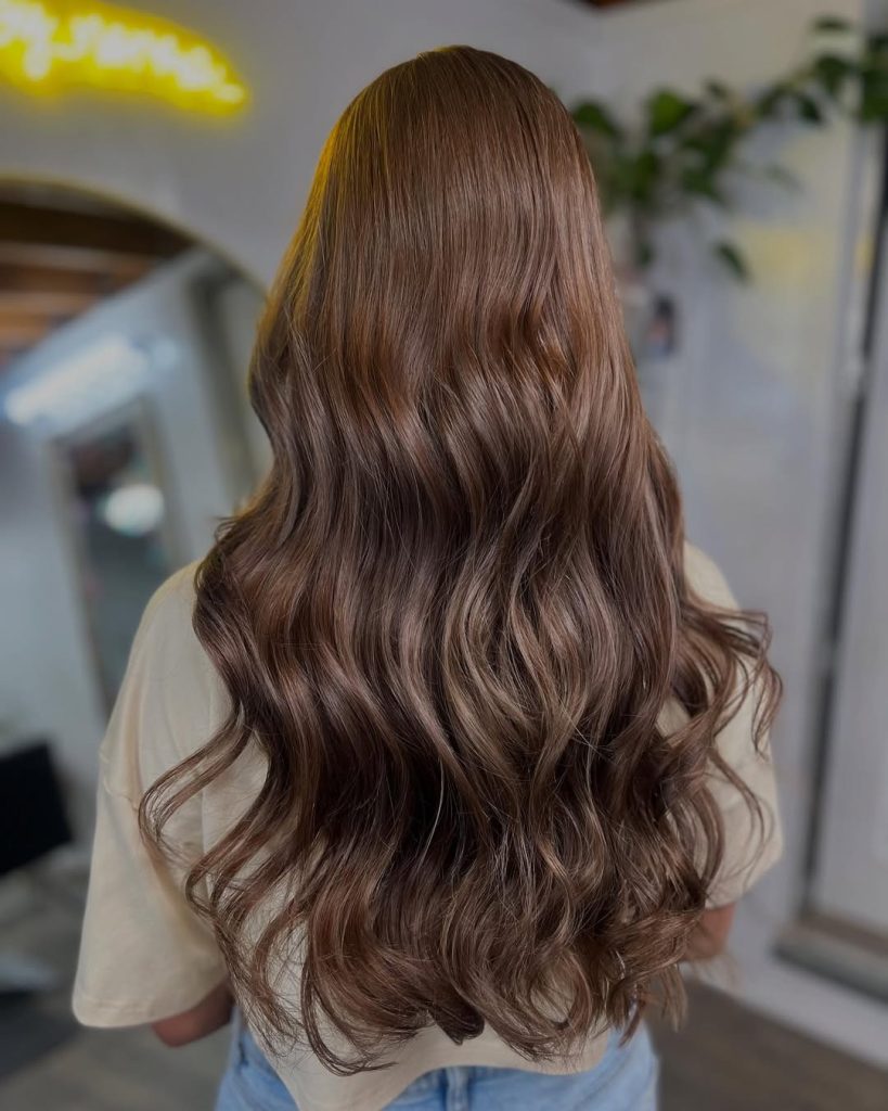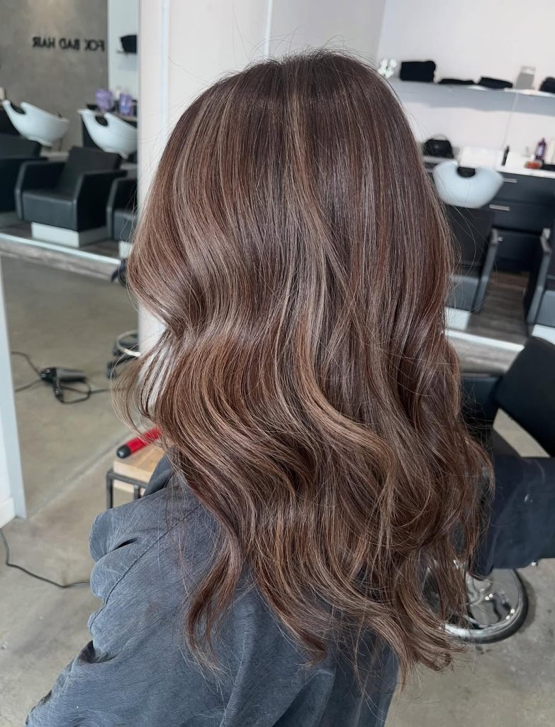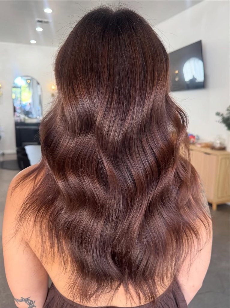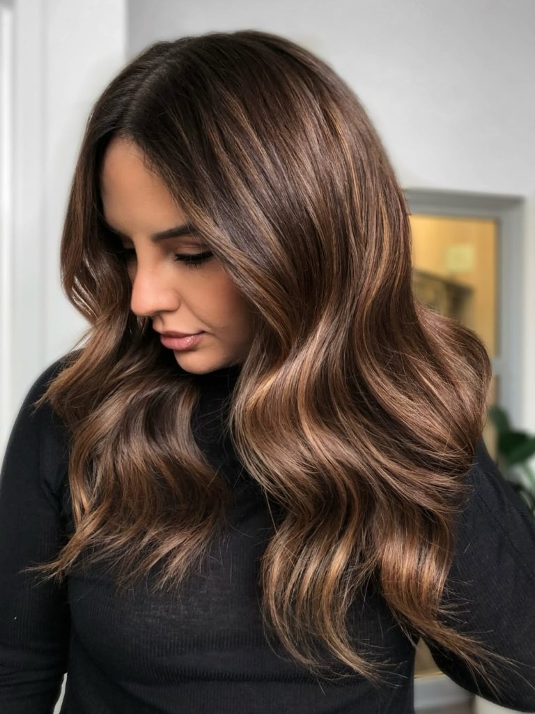 This is the approachable “cool girl brunette” version: mocha-chestnut with airy waves and a gentle warm glow that reads “honey” when light hits it. The dimension feels like balayage—soft, blended, and naturally graduated—so it grows out without that harsh line that makes you dread your next appointment.