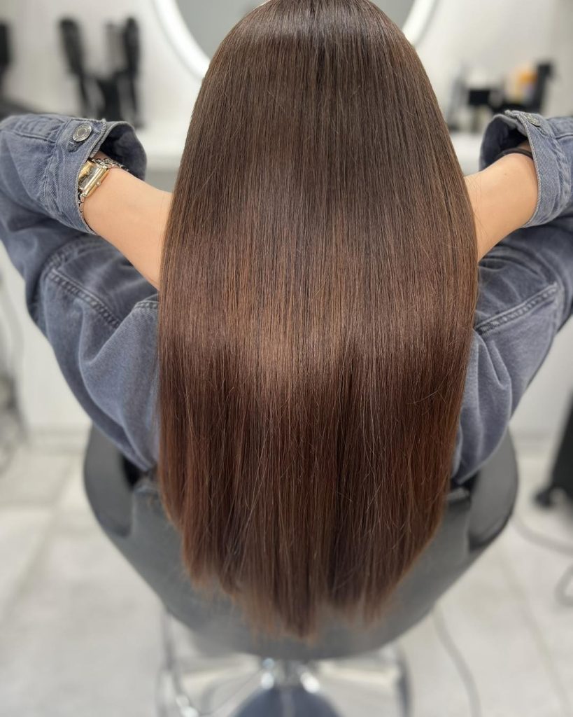 This version is moodier and slightly cool—a deep brunette-chestnut that reads elegant rather than sun-kissed. The crown stays intentionally dark, while the mid-lengths have a quiet, tonal shift created by lowlights and very subtle contrast. Instead of bright pieces, the dimension is “inside the hair,” which is exactly what makes it look grown-up and expensive.