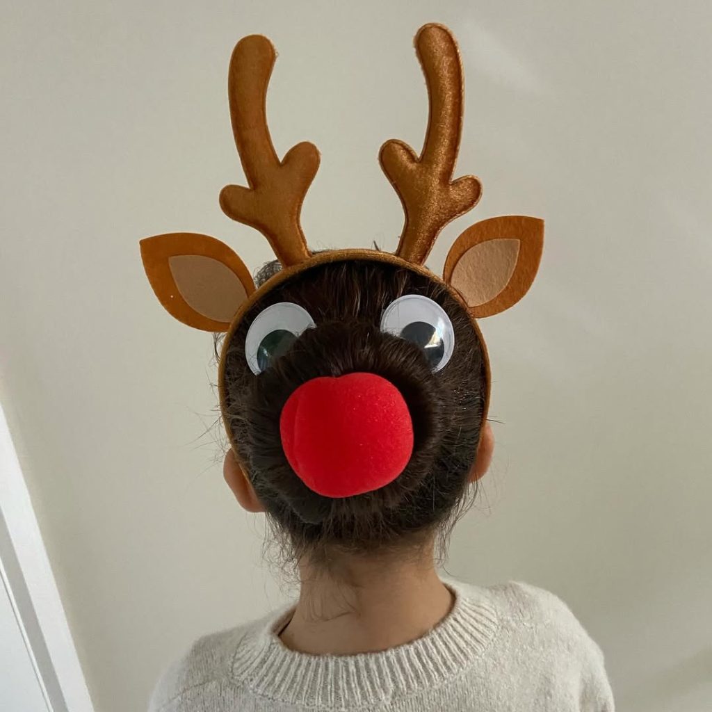 A sleek bun becomes a Rudolph face with a foam red nose, felt antlers, and googly eyes—pure holiday joy. It’s whimsical, incredibly Fun, and so Quick to assemble once the bun is snug.