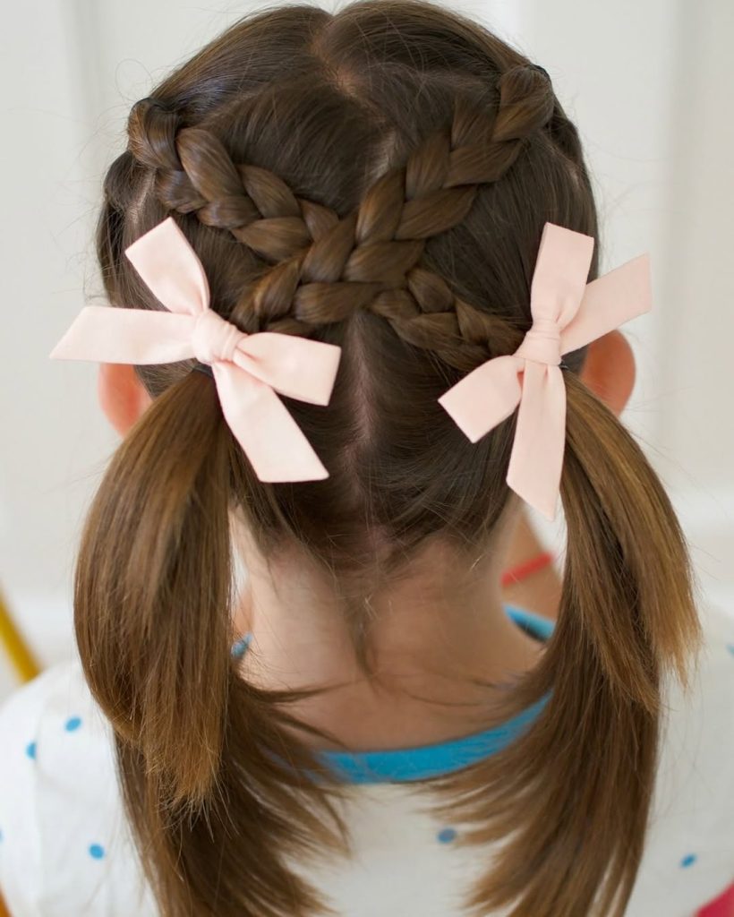 Two French braids begin near the temples, cross at the center back like a ribbon, and land in low pigtails finished with blush bows. The crossover creates a star point that feels instantly festive for pageants or cookie swaps.