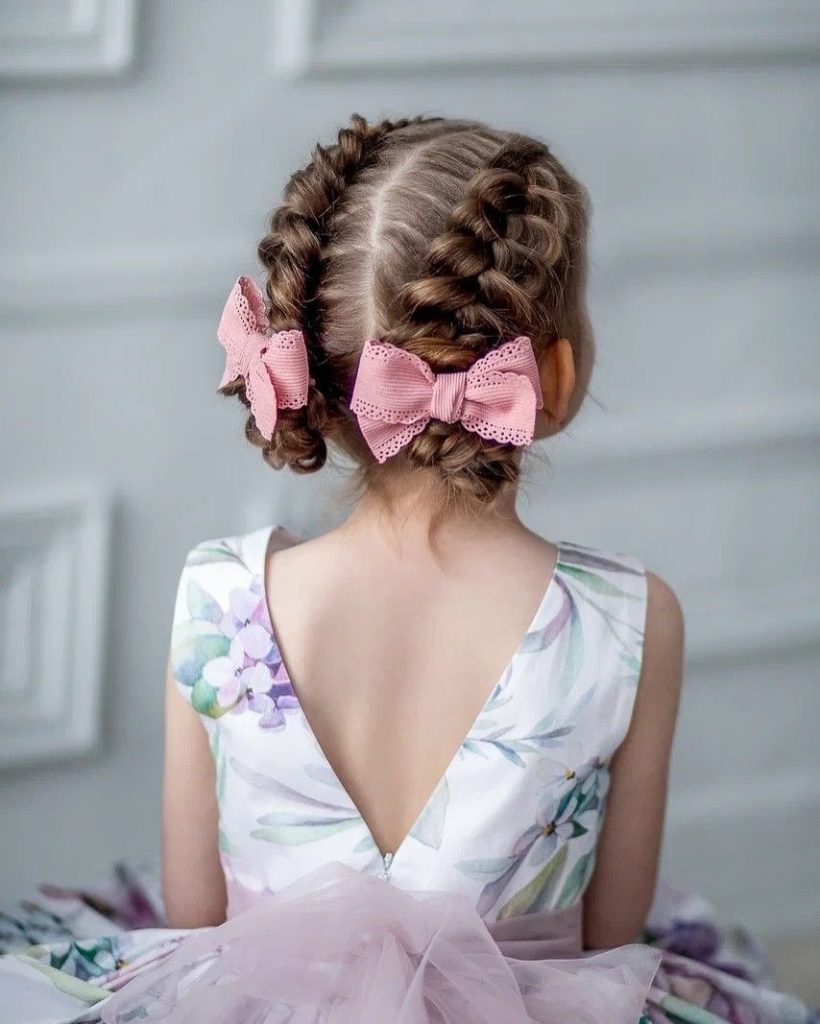 Chunky Dutch braids track along each side and tuck into plush low buns, trimmed with airy lace bows. The raised braid adds texture so the style photographs beautifully beside tulle dresses and winter florals.