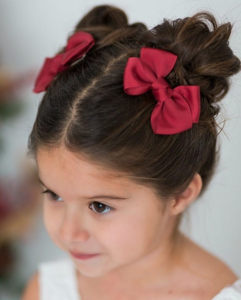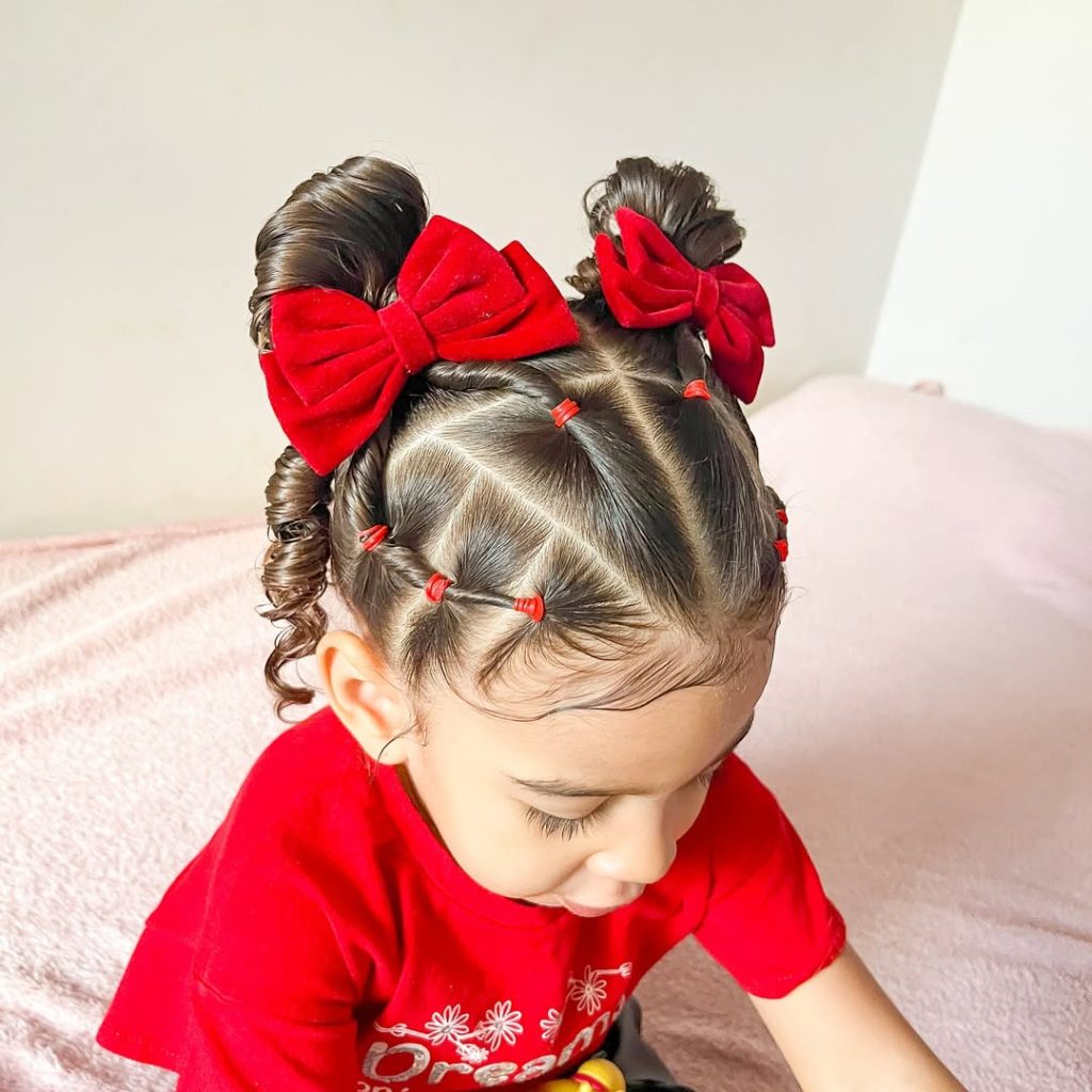 Tiny diagonal sections are tied into an “elastic ladder,” guiding hair into two compact top-knots. Velvet bows crown each bun, and soft spiral curls at the nape keep the finish sweet and celebratory.